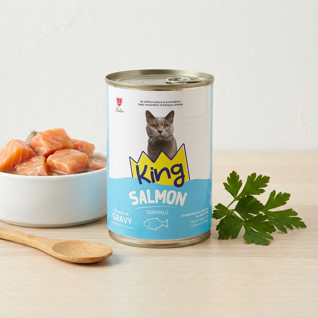 King Sos İçerisinde Et Parçacıklı Somonlu Kedi Konservesi | 400 gr x 12 Adet