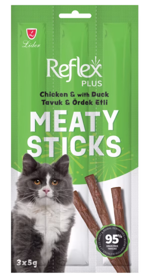 Meaty Sticks 3×5 Gr, kedileriniz için tavuk ve ördek etinin lezzetini bir araya getiren, besleyici ve pratik bir ödül mamasıdır. Küçük çubuk formu sayesinde ara öğünlerde veya ödüllendirme sırasında kolayca kullanılabilir.