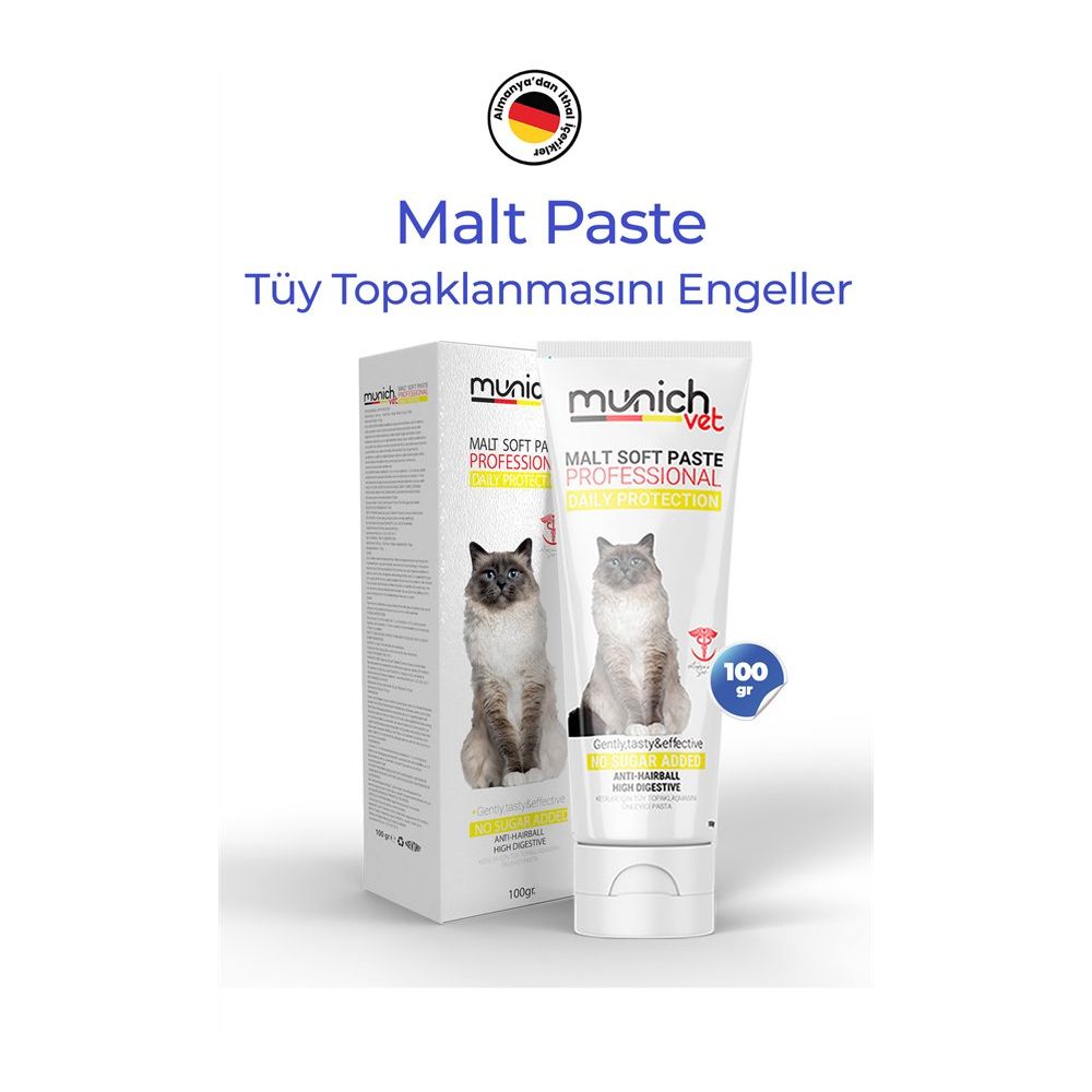 Munich Vet Malt Paste 100 ml Tüy Yumağı Önleyici Macun, kedinizin sindirim sağlığını korumak ve yaşam kalitesini artırmak için özel olarak formüle edilmiştir. Kediler, temizlik içgüdüleri gereği günün büyük bir kısmını kendilerini yalayarak geçirirler. Bu süreçte yutulan tüyler, zamanla mide ve bağırsaklarda birikerek tüy yumaklarına (hairball) dönüşebilir. Bu durum, sevimli dostunuzda kusma, iştahsızlık ve sindirim bozukluklarına yol açabilir.