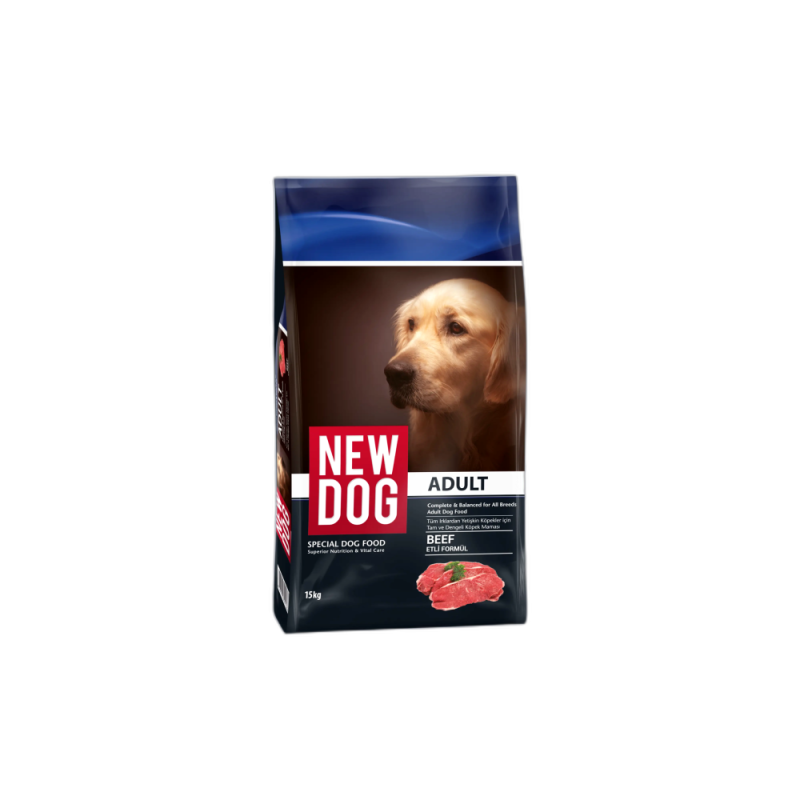 New Dog Biftekli Yetişkin Köpek Maması 15 Kg, 1 yaş ve üzeri yetişkin köpeklerin beslenme ihtiyaçlarını karşılamak üzere geliştirilmiş premium kuru mamadır.