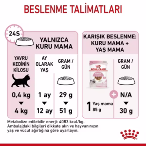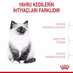 ROYAL CANIN® Kitten, yavru kedilerin büyümelerinin “konsolidasyon evresinde” beslenme ihtiyaçlarını desteklemek için özel olarak formüle edilmiştir. Bu formül, fiziksel ve davranışsal açıdan önemli değişimler yaşayan 12 aylığa kadar olan yavru kediler için uygundur. Bu özel formül, yavru kedinizin artan enerji ihtiyacını karşılamaya ve kemik ve kas gelişimini desteklemeye yardımcı olmak için uyarlanan seviyelerde protein, mineraller ve vitaminler içerir.