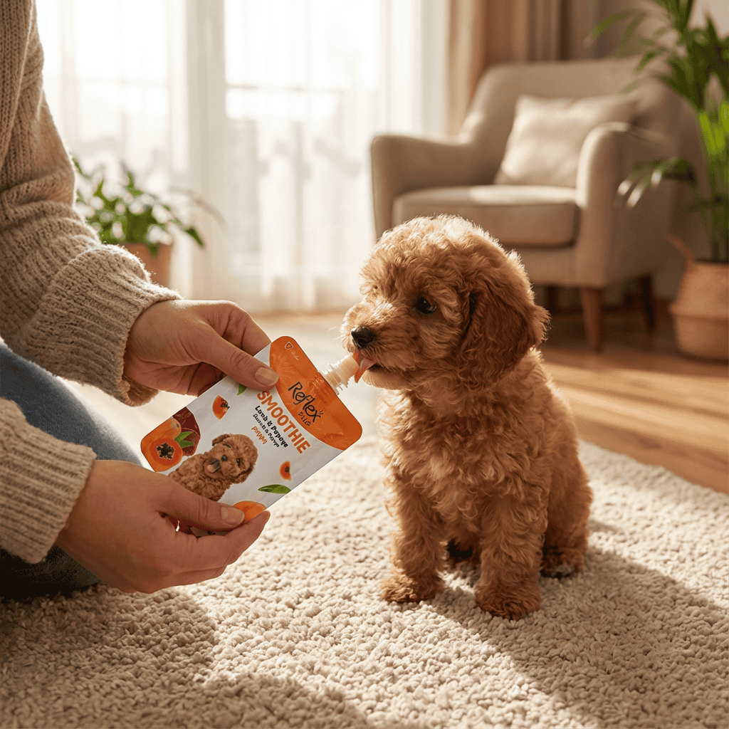Smoothie Kuzu Etli ve Papaya Yavru Köpek Sıvı Ödül Maması, yavru köpekler için lezzetli, besleyici ve kolay tüketilebilir sıvı ödül sunar. Kuzu eti ve papaya aromasıyla yavru köpeğinizin damak tadına hitap eder, aynı zamanda sindirimi kolaydır.