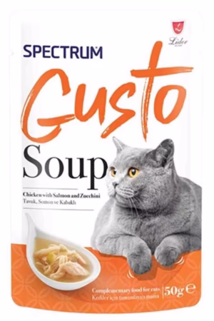 Spectrum Gusto Tavuklu Somon Balıklı ve Kabaklı Kedi Çorbası 50 g, kedinizin damak zevkine hitap eden, besleyici ve sulu bir yaş mamadır.