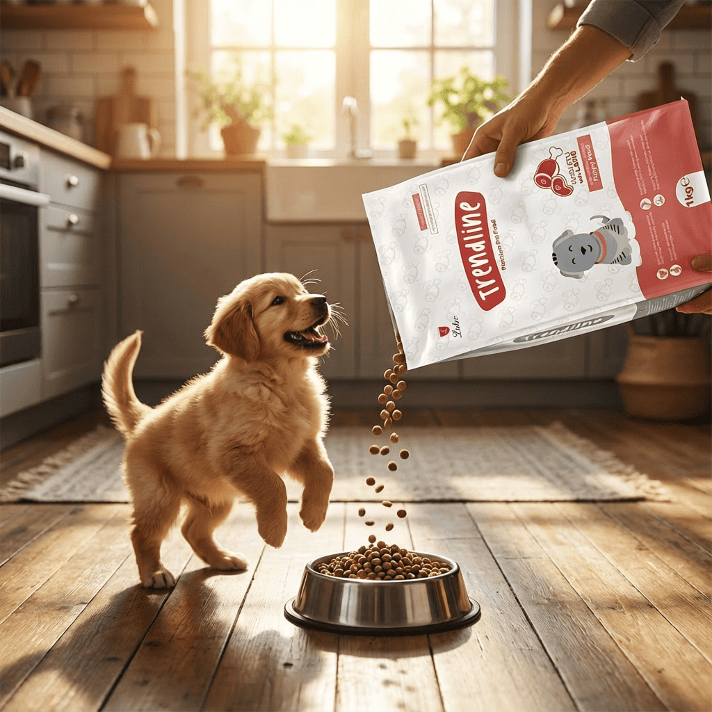 Trendline Kuzu Etli Pirinçli Yavru Köpek Maması 15 Kg, 2–12 aylık yavru köpeklerin gelişim döneminde ihtiyaç duyduğu besin öğelerini karşılamak üzere özel olarak formüle edilmiş kuru mamadır.